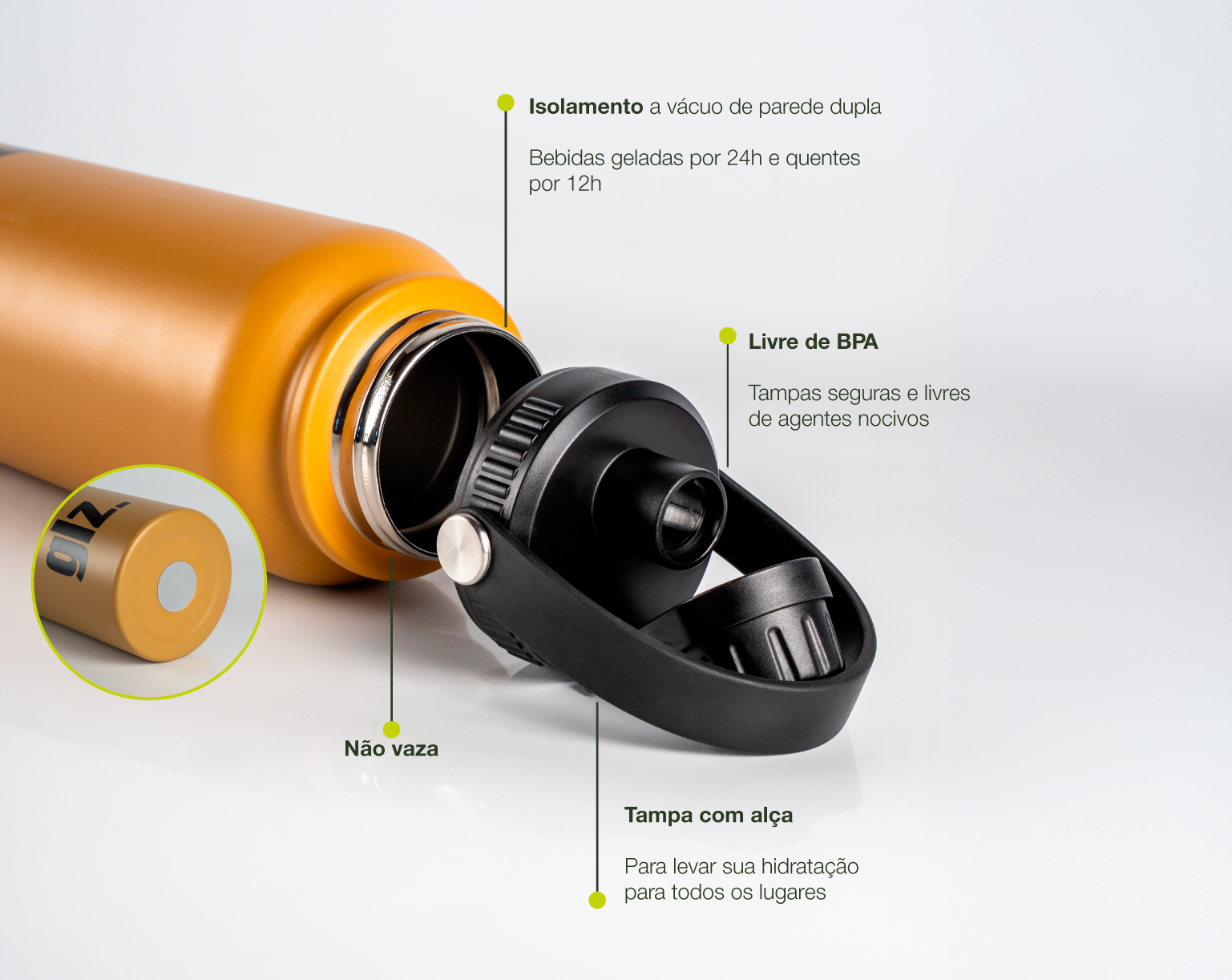 É feita em aço inoxidável de alta resistência, sem BPA, não transfere sabor nem cheiro aos líquidos.